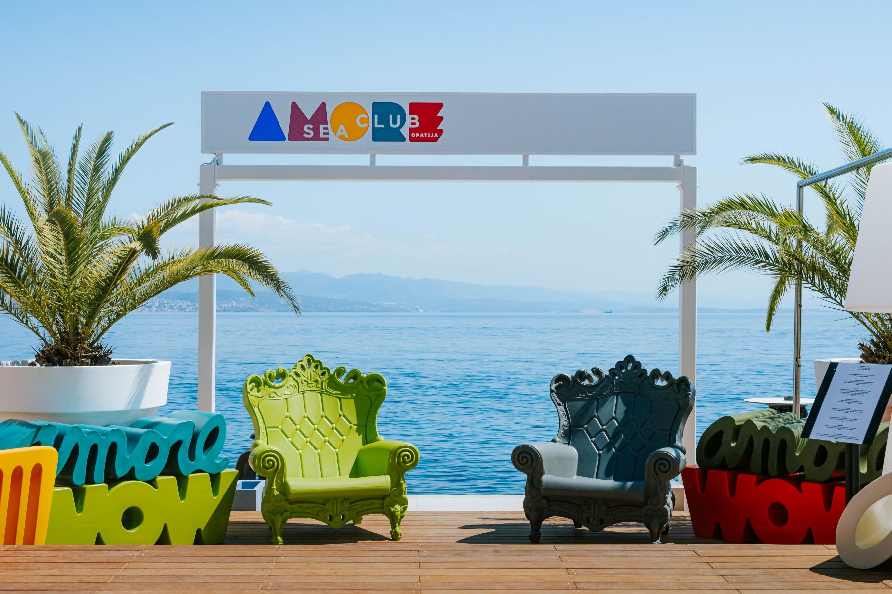 Amore Sea Club prava je vibrantna lounge zona s urbanim DJ ritmovima, idealna za dnevni odmor uz more, ali i večernji izlazak. Terasa je tokom cijele godine otvorena i za privatna događanja i posebne proslave. Odmah ispred terase Amore Sea Cluba proteže se 70 metara rive koja će do iduće godine moći primiti desetak većih luksuznih , uz potpunu infrastrukturu i neposrednu blizinu svih ključnih sadržaja Opatije. Amore Sea Club zamišljen je kao nezaobilazno mjesto za vlasnike i goste luksuznih jahti – prostor za uživanje u kreativnim jelima chefa Filipa Akrapa, bogatoj ponudi vina i koktela te pogledu na ono najljepše što Opatija i Jadran nude.